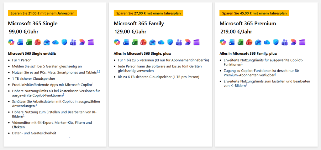 Unterschieden wir mittlerweile auch in Programmpakete mit Teams bzw, ohne Teams; Die neusten Editionen sind auch die KI-Versionen mit Copilot.